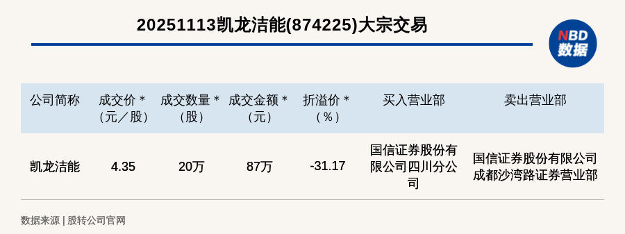 每經訊,2025年11月13日,新三板創(chuàng)新層公司凱龍潔能(874225,收盤價:6.32元)發(fā)生一筆大宗交易,成交價4.35元/股,成交數量20萬股,成交金額87萬元,折價31.17%。買入營業(yè)部是國信證券股份有限公司四川分公司,賣出營業(yè)部是國信證券股份有限公司成都沙灣路證券營業(yè)部。