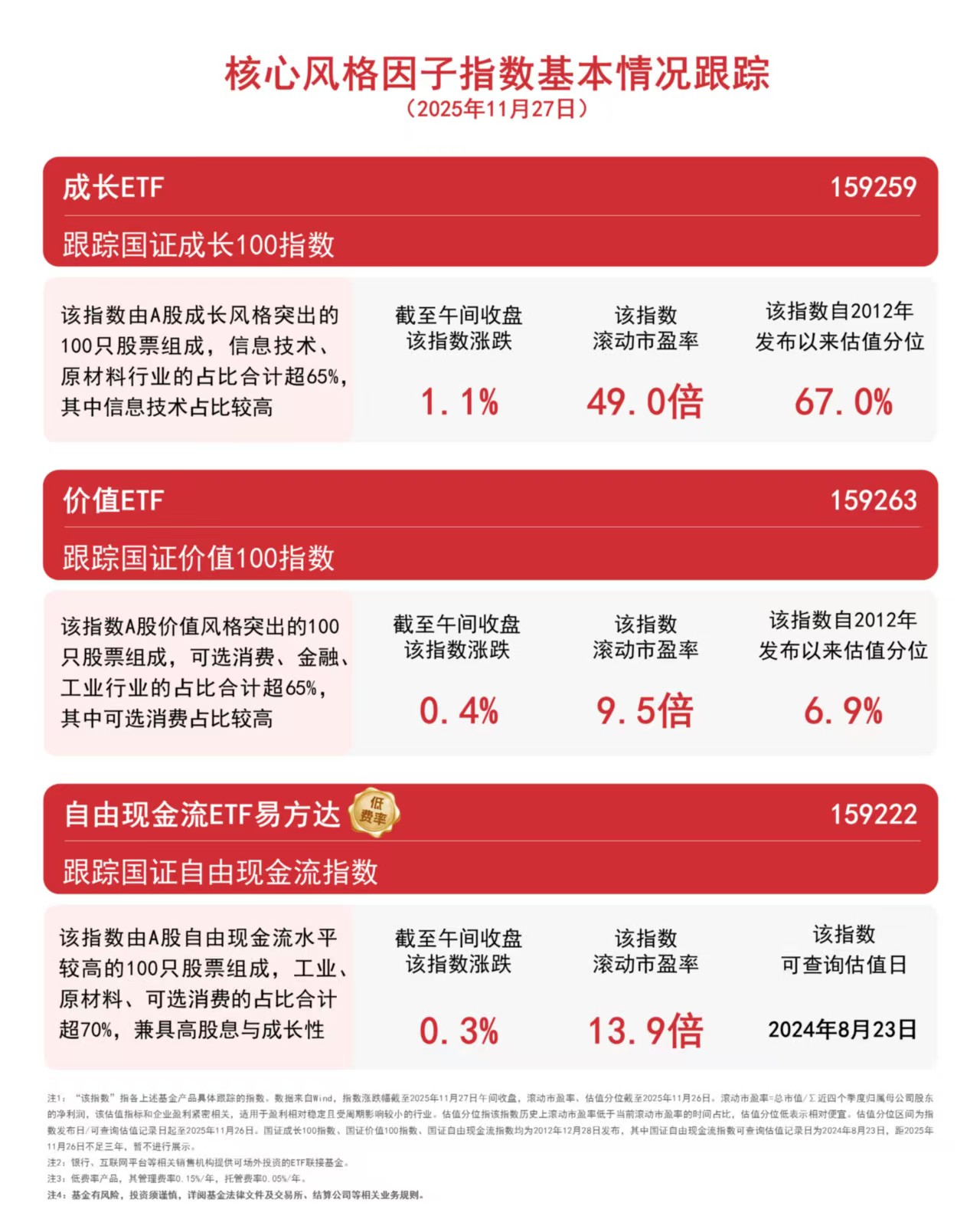 今日早盤,成長風(fēng)格延續(xù)漲勢,截至午間收盤,國證成長100指數(shù)上漲1.1%,國證價值100指數(shù)上漲0.4%,國證自由現(xiàn)金流指數(shù)上漲0.3%。