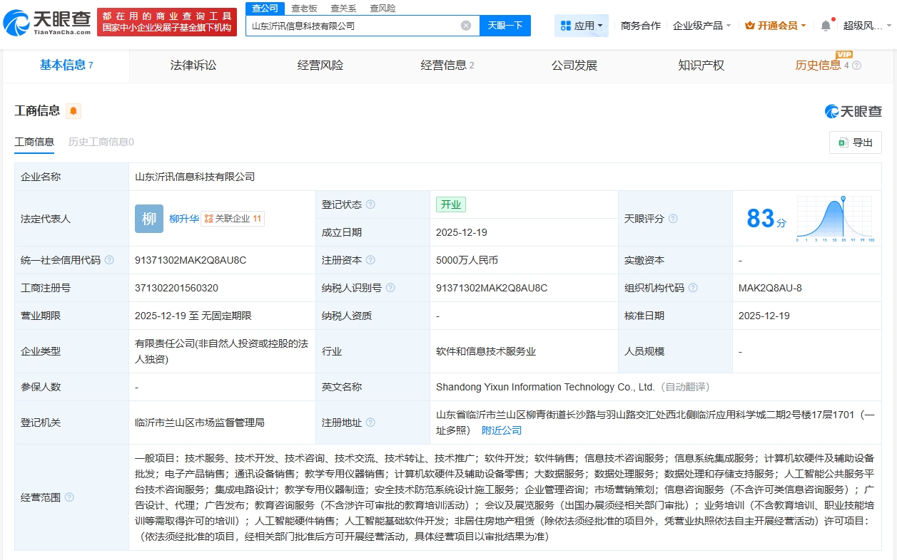 每經(jīng)AI快訊,天眼查工商信息顯示,近日,山東沂訊信息科技有限公司成立,法定代表人為柳升華,注冊資本5000萬元人民幣,經(jīng)營范圍包括人工智能公共服務(wù)平臺技術(shù)咨詢服務(wù)、集成電路設(shè)計、人工智能基礎(chǔ)軟件開發(fā)等。股東信息顯示,該公司由科大訊飛(002230)全資持股。