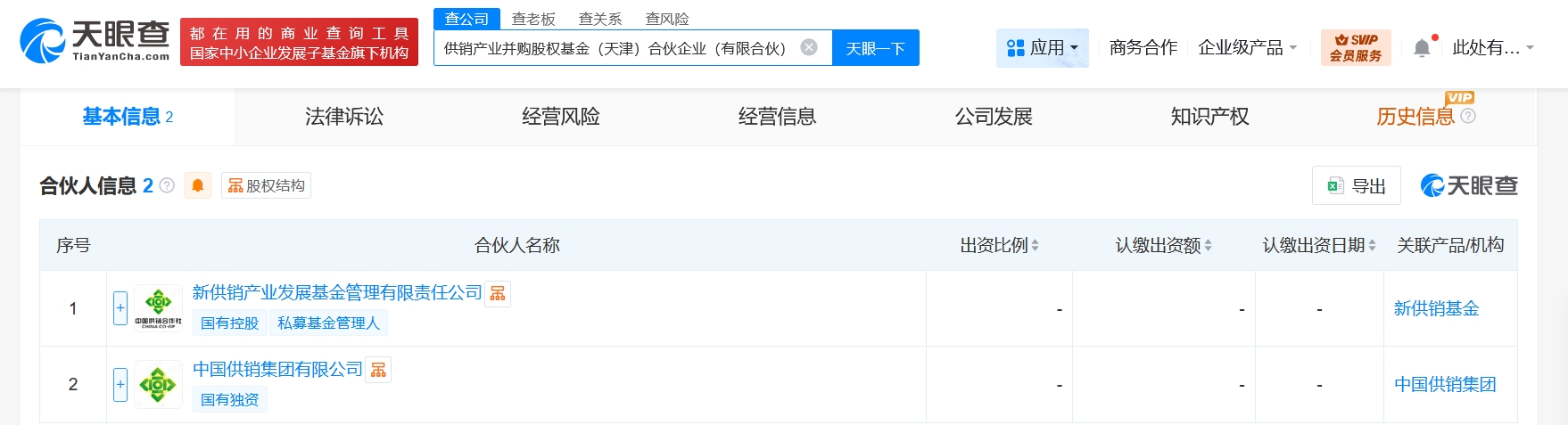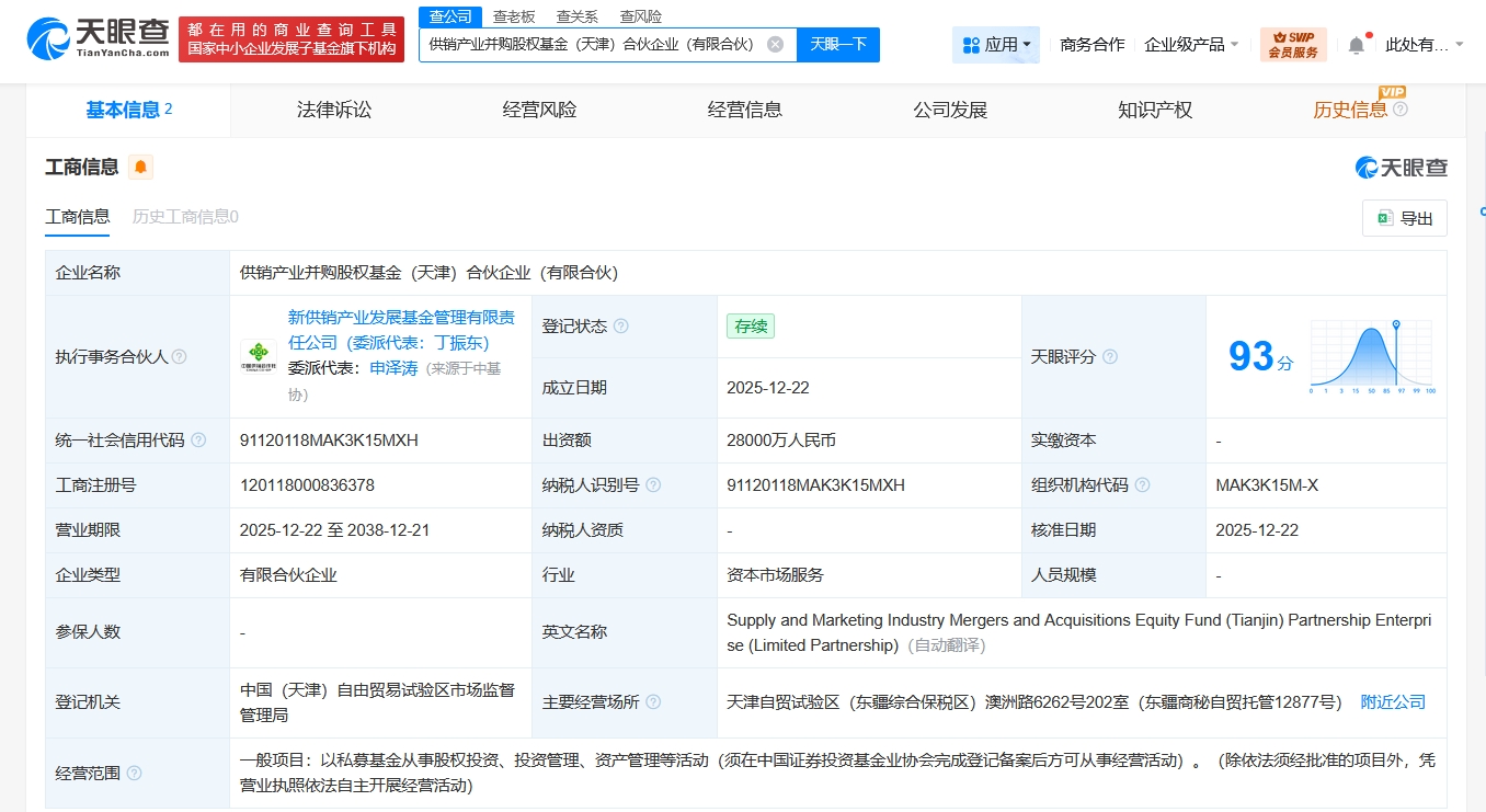 每經(jīng)AI快訊,天眼查App顯示,近日,供銷(xiāo)產(chǎn)業(yè)并購(gòu)股權(quán)基金(天津)合伙企業(yè)(有限合伙)成立,執(zhí)行事務(wù)合伙人為新供銷(xiāo)產(chǎn)業(yè)發(fā)展基金管理有限責(zé)任公司,出資額2.8億元人民幣,經(jīng)營(yíng)范圍為以私募基金從事股權(quán)投資、投資管理、資產(chǎn)管理等活動(dòng)。合伙人信息顯示,該基金由中國(guó)供銷(xiāo)集團(tuán)有限公司及旗下新供銷(xiāo)產(chǎn)業(yè)發(fā)展基金管理有限責(zé)任公司共同出資。