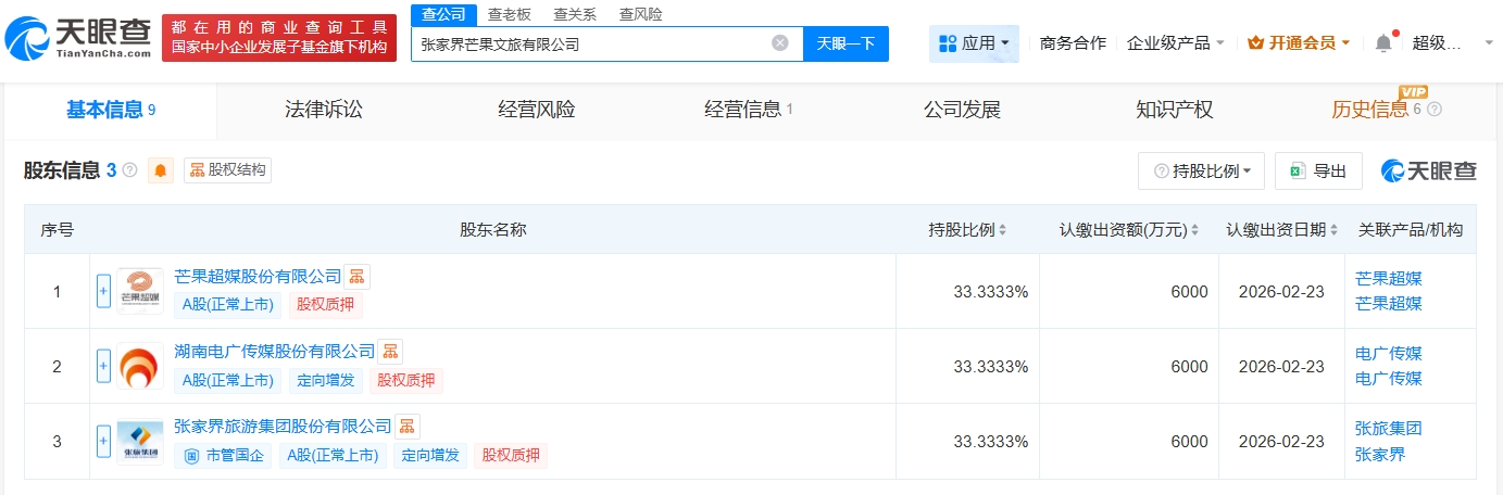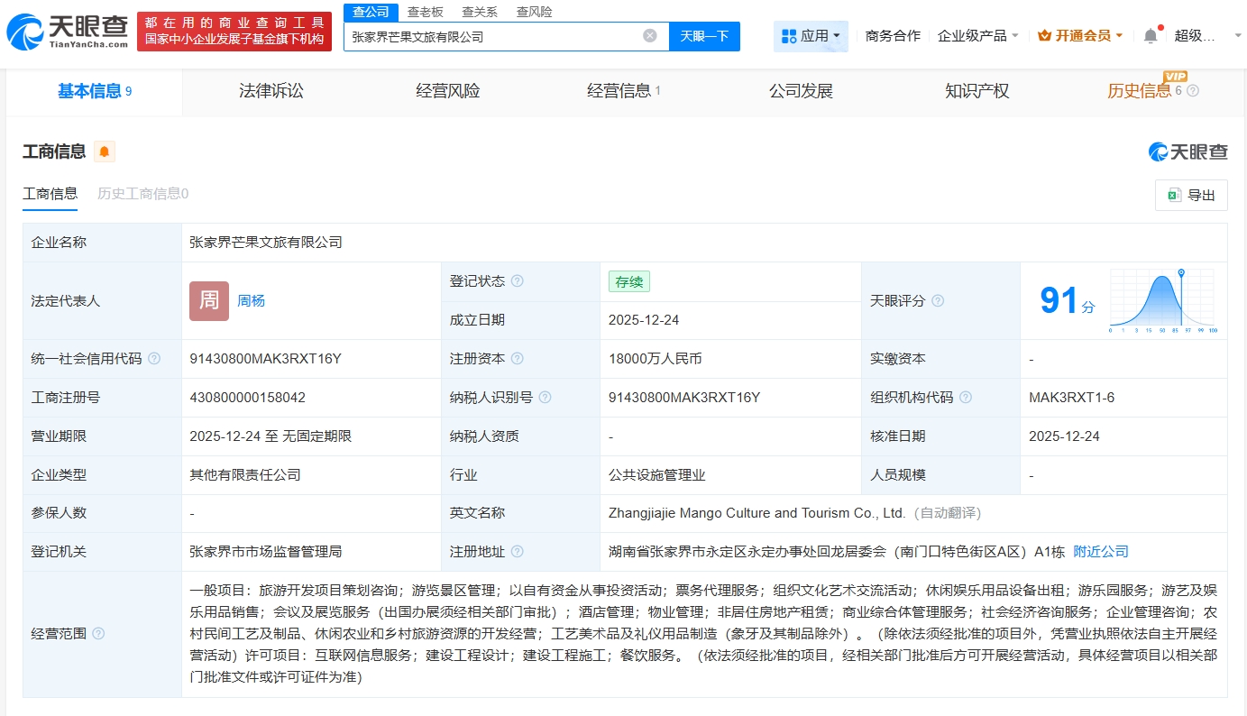 每經(jīng)AI快訊,天眼查App顯示,近日,張家界芒果文旅有限公司成立,法定代表人為周楊,注冊資本1.8億元人民幣,經(jīng)營范圍包括旅游開發(fā)項目策劃咨詢、游覽景區(qū)管理、以自有資金從事投資活動、票務代理服務等。股東信息顯示,該公司由芒果超媒(300413)、電廣傳媒(000917)、張家界旅游集團股份有限公司共同持股。