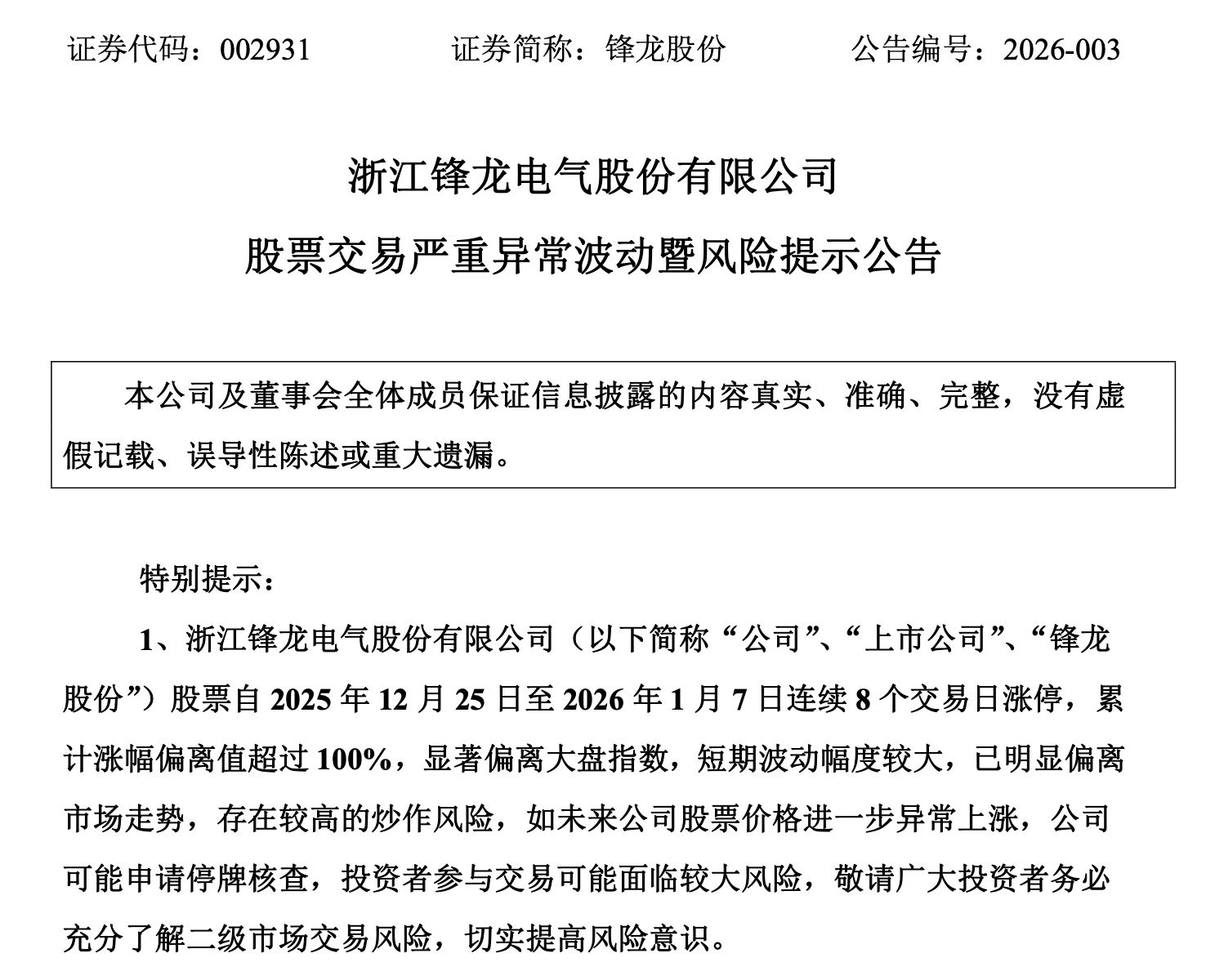 1月7日晚,鋒龍股份公告稱,公司股票自2025年12月25日至2026年1月7日連續(xù)8個交易日漲停,累計漲幅偏離值超過100%,顯著偏離大盤指數(shù),短期波動幅度較大,已明顯偏離市場走勢,存在較高的炒作風險,如未來公司股票價格進一步異常上漲,公司可能申請停牌核查,投資者參與交易可能面臨較大風險,敬請廣大投資者務必充分了解二級市場交易風險,切實提高風險意識。