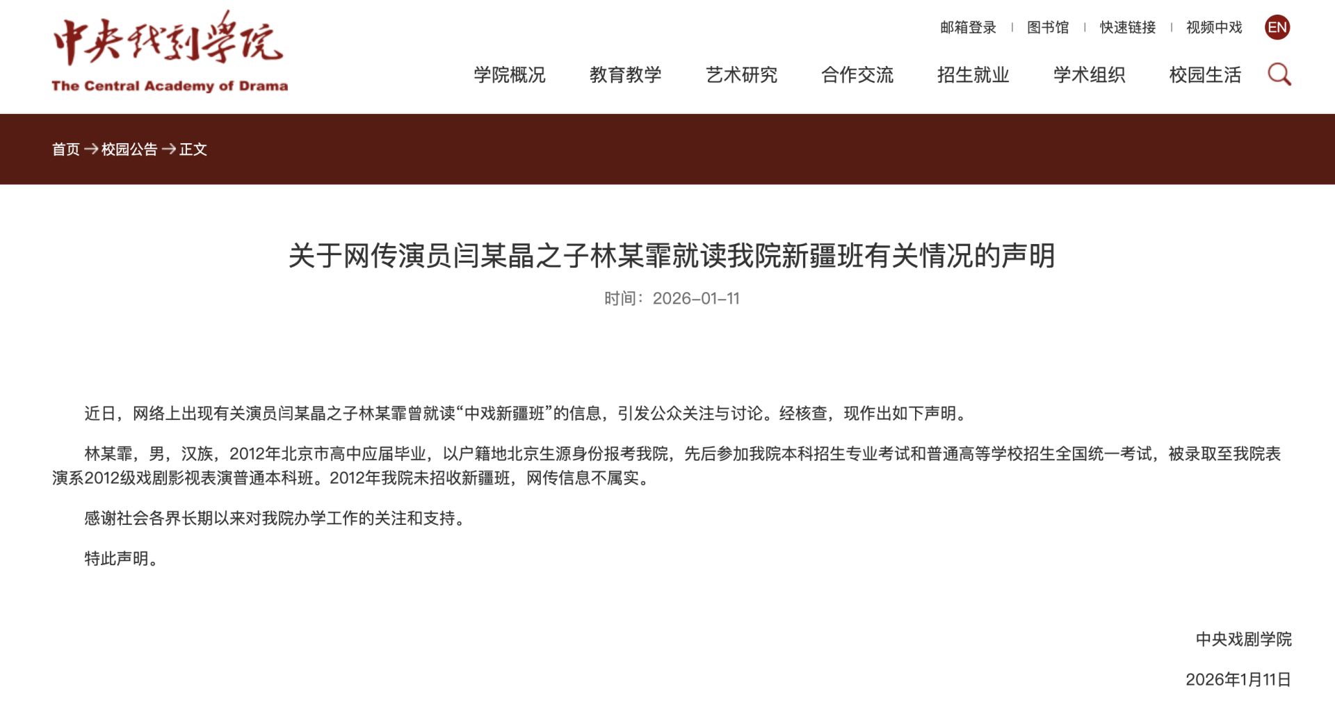 據(jù)中央戲劇學(xué)院網(wǎng)站1月11日通報:近日,網(wǎng)絡(luò)上出現(xiàn)有關(guān)演員閆某晶之子林某霏曾就讀“中戲新疆班”的信息,引發(fā)公眾關(guān)注與討論。經(jīng)核查,現(xiàn)作出如下聲明。