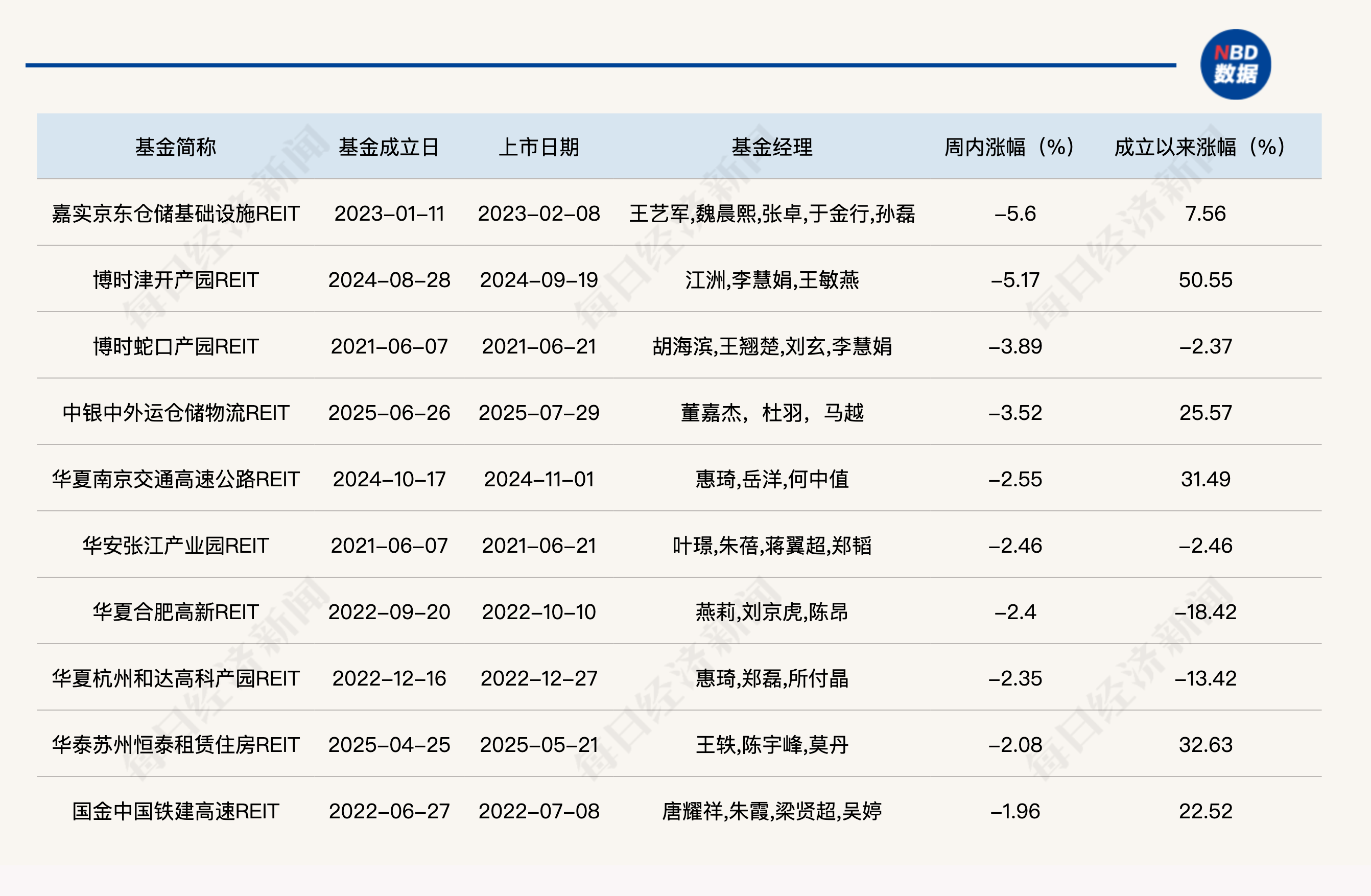 上周跌幅排名前十的公募REITs