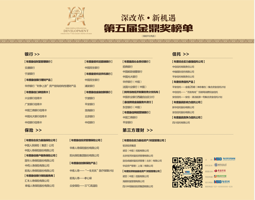 由《每日經(jīng)濟(jì)新聞》主辦的一年一度的“2014中國金融發(fā)展論壇暨第五屆金鼎獎榮譽(yù)盛典”活動即將拉開帷幕,本次活動以“深改革?新機(jī)遇”為主題, 從財(cái)富管理的角度關(guān)注金融業(yè)的發(fā)展新趨勢。本次金鼎獎活動作為《每日經(jīng)濟(jì)新聞》年度大型金融行業(yè)活動,已經(jīng)成功舉辦四屆,均獲得圓滿成功,得到了行業(yè)內(nèi)各大金融機(jī)構(gòu)的關(guān)注和認(rèn)可。